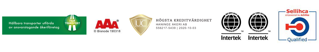 Haninge åkeri är kvalitetscertifierat enl ISO 9001 sedan april 1998 och miljöcertifierat enl ISO 14 001 sedan mars 2001. Vår fordonspark består idag av Euro 6 fordon.